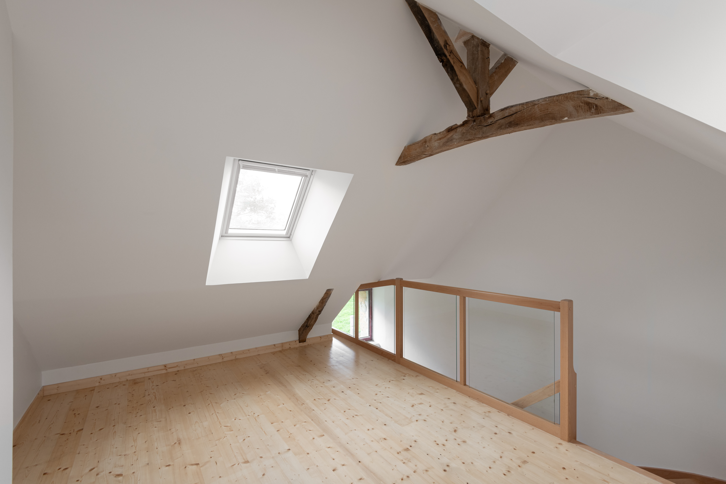 L’intervention a visé à préserver le caractère authentique de l’édifice tout en l’adaptant aux usages contemporains. Le projet comprend l’aménagement d’un salon-séjour ainsi que d’une chambre à l’étage, avec la conservation et la mise en valeur d’un plancher bois apparent, élément fort du charme de l’ancien.